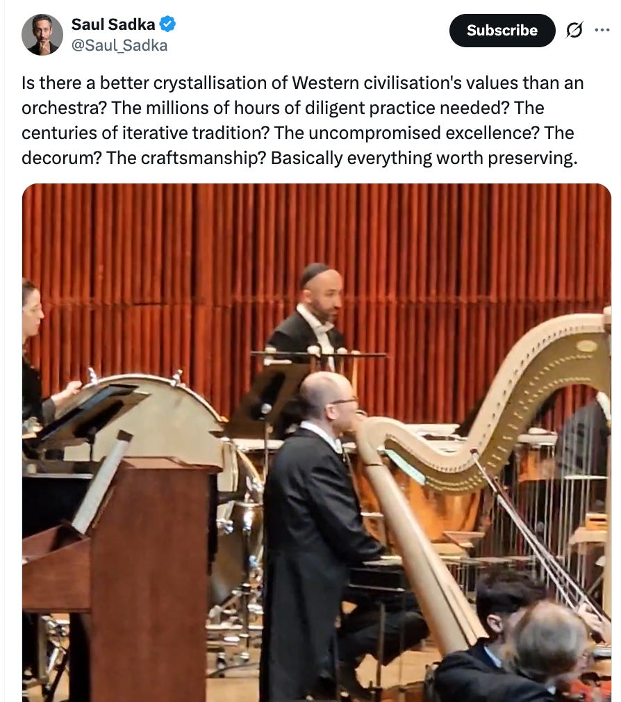 And above all, the world of classical music is the least-DEI-infected cultural institution I can identify. Symphony orchestras conduct blind auditions, with musicians hidden behind a screen to be judged on their sound alone. (Of course there are people who are trying to change that.) It’s a world of excellence, of people who’ve spent their lives working diligently to do something freakishly hard, with great discipline. They take pleasure in the thing itself, in the way it sounds. Nothing falls outside the frame of excellence, discipline, beauty, and craft.