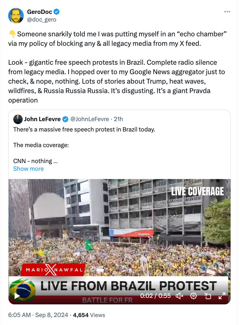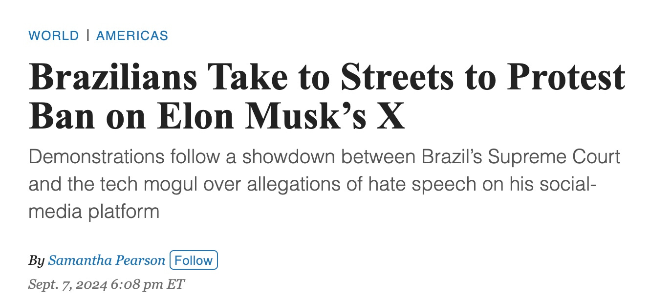 Brazil is banning free speech and political opposition to protect democracy, so Brazilians are in the street because they don’t care, and people are trying to use X in Brazil but they can’t, which proves that they don’t want to use it.