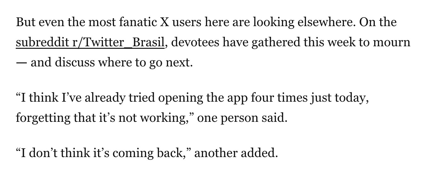 X is banned, but people are trying to open it, but they can’t, because it’s banned. See, this proves that people are indifferent to the loss of the platform. They’re trying to use it, which proves that they don’t care about it. “Its suspension has further weakened its capacity to compete with other social media companies,” the story helpfully explains. I no longer wish to walk on my legs, because they have been amputated.