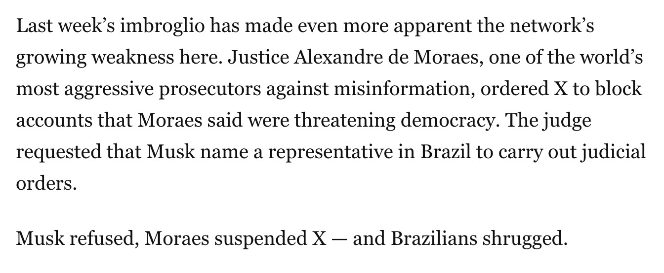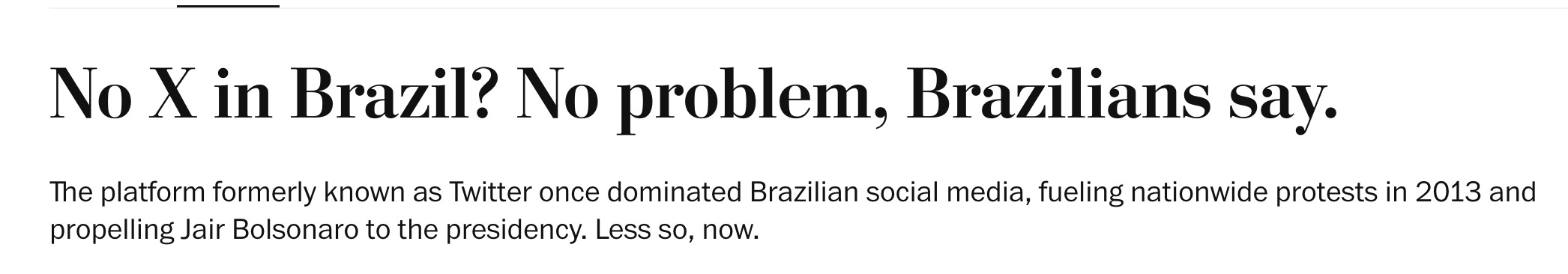 I tested this, and the little bit of news that shows up in American mainstream media is absolutely remarkable. A few days ago, the Washington Post calmly explained that Brazilians just don’t care at all about this meaningless X platform thing, and are indifferent to the fact that it has been banned.