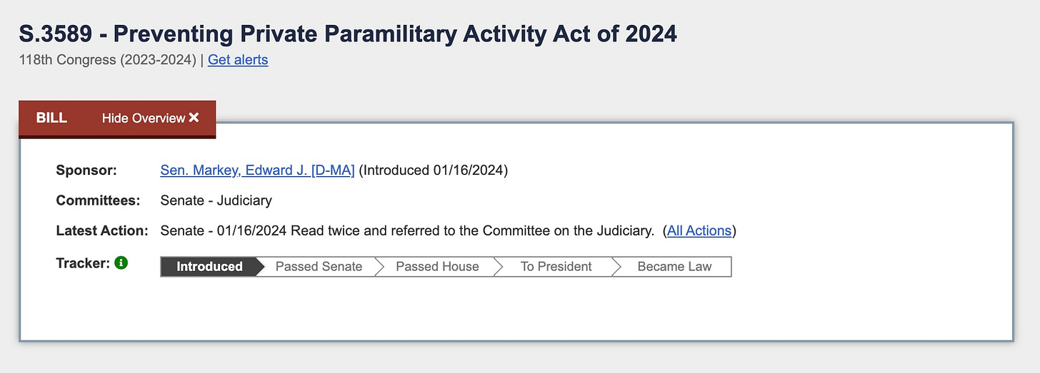 Ed Markey is going to criminalize private militias, because private militias are very dangerous and far-right. Here, read his explanation: “As evidenced by the January 6, 2021, attack on the U.S. Capitol, private paramilitary actors like the Proud Boys and Oath Keepers pose a serious threat to democracy and the rule of law.”