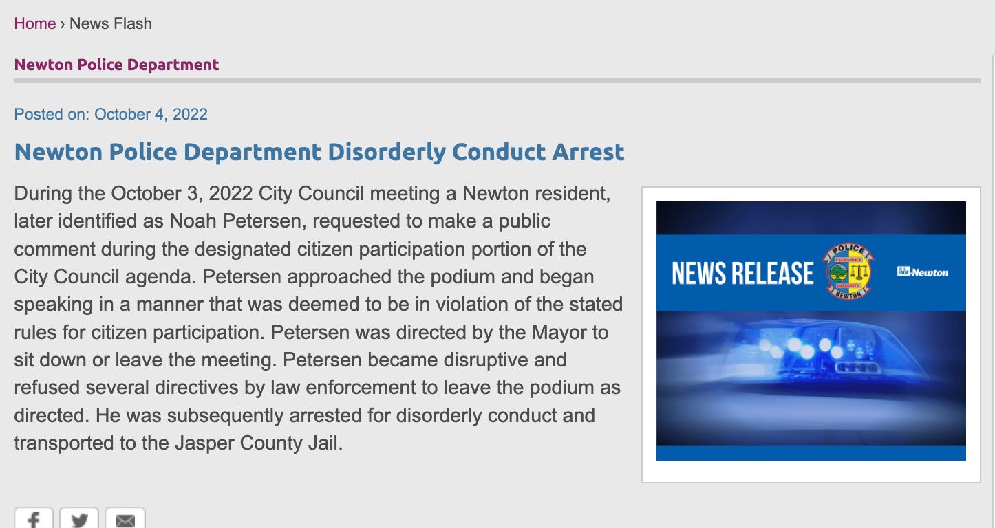 The city’s rules for public comment (see Item #4) prohibit “derogatory statements or comments about any individual.” From the City of Newton’s website, here’s the police department’s Idiocracy-quality press release on the arrest: