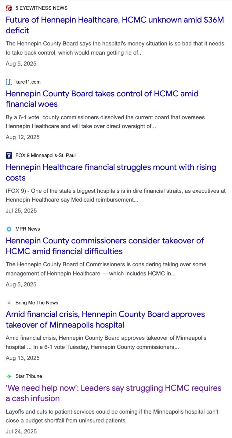 Yesterday, the journalist Liz Collin posted an all-staff email message to Hennepin Healthcare employees that warns about a newly dire financial crisis: “For months, cash on hand has hovered around zero, and in early January the system’s cash position went negative…We are now fully in crisis mode and must act decisively…To continue operating, we must identify at least $50 million in savings during the first quarter of 2026, and based on current trends, tens of millions more by year-end….The future of our hospital is at risk in this moment.”