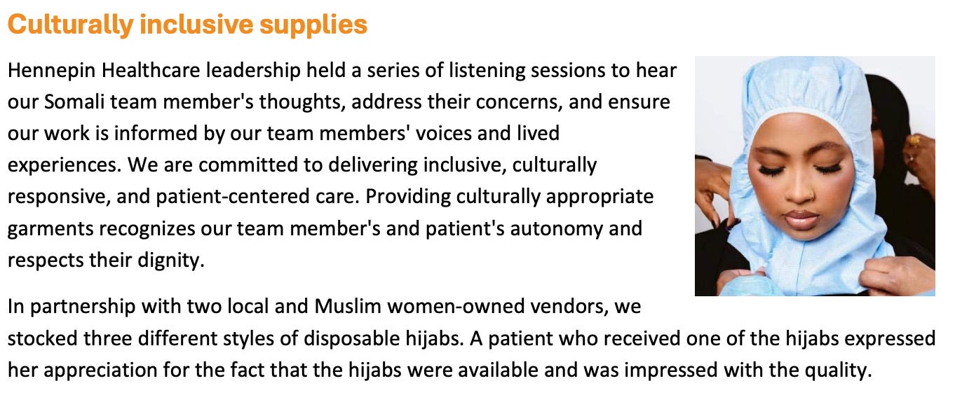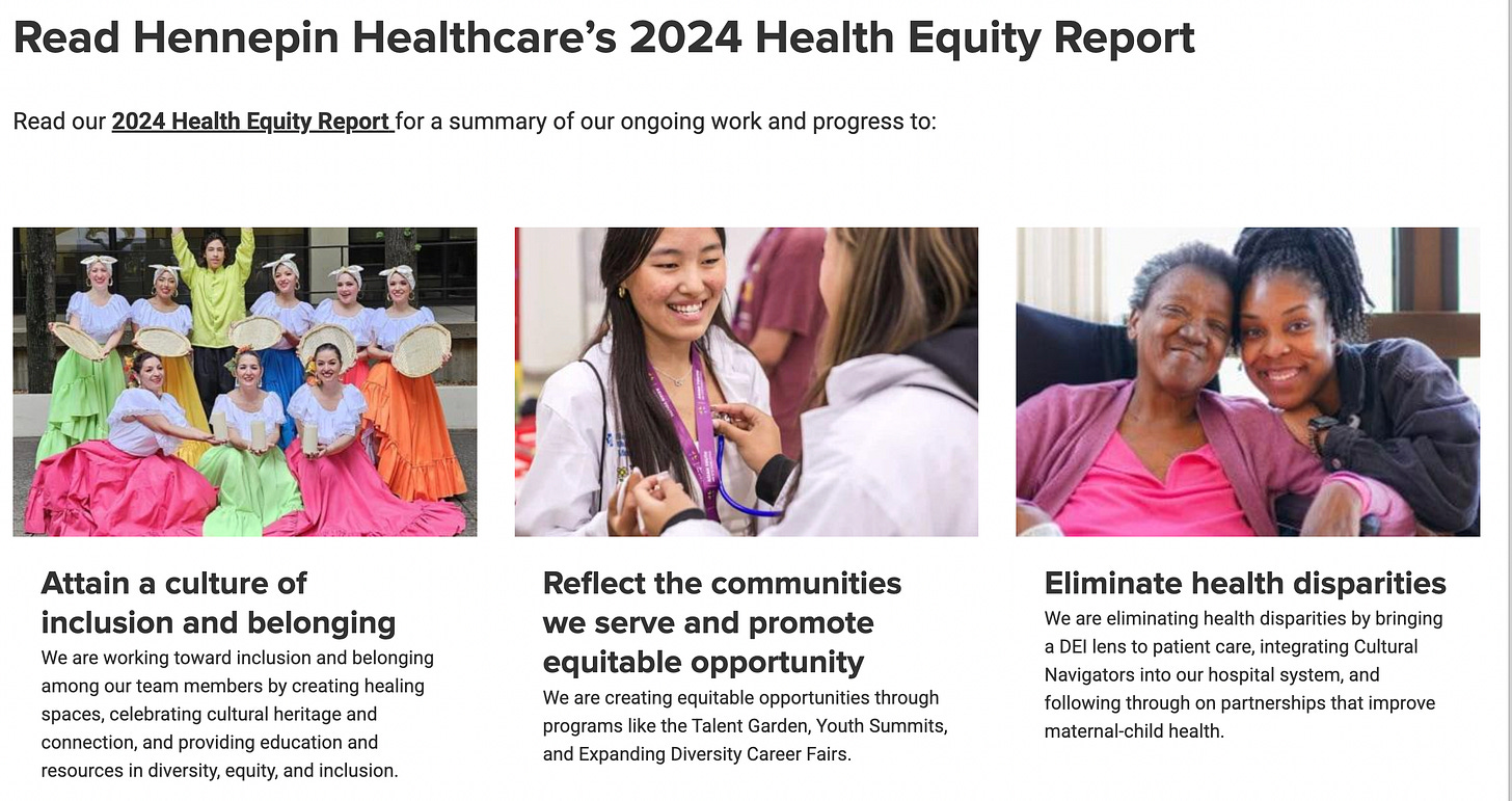 The executive who oversees that team, along with a bunch of other DEI initiatives, is the Chief Equity officer, who makes a base salary — see pg. 8 here — of $357,000 a year. Here, watch her define the healthcare system’s most important goal, and notice that it isn’t “healing sick people,” which apparently is less important: “Nneka Sederstrom, the health system’s chief equity officer, said budget challenges put the hospital’s core mission of reducing health disparities at risk. The county declared racism as a public health crisis in 2020.” The healthcare system that treats racism as a medical problem now regards itself as a provider of total lifestyle support, not merely medicine, and provides benefits like this (see pg. 24): “Pre-packed bags of food available to patients at clinic visits.”