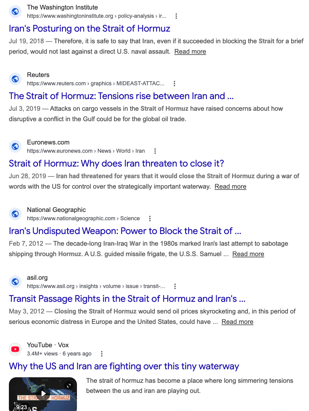No single fact about a war with Iran is more obvious than the importance of the Strait of Hormuz, which a hamster could figure out if you showed it a map. Note the dates on these sample Google search results: