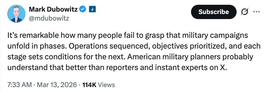 Of course they knew Iran would try to close the Strait of Hormuz, and probably succeed for a while, a topic the Pentagon’s war planners have been gaming out for decades. But a temporary closure in the second week of a war isn’t a disaster. The third month of a closure very much will be, and the sixth month would be devastating. The “instant pudding” concept of war is a waste of oxygen. If the tankers are moving through the strait in a week or two, the impact will pass. Maybe that won’t happen, and then we’ll begin to see that a sustained crisis is possible. Maybe wait ten minutes before dooming all of humanity on social media. Note that I’m not saying the closure of the Strait of Hormuz isn’t a crisis. Rather, I’m saying that there’s at least a chance that it turns out to be a limited and temporary crisis, and one that we recover from quickly.