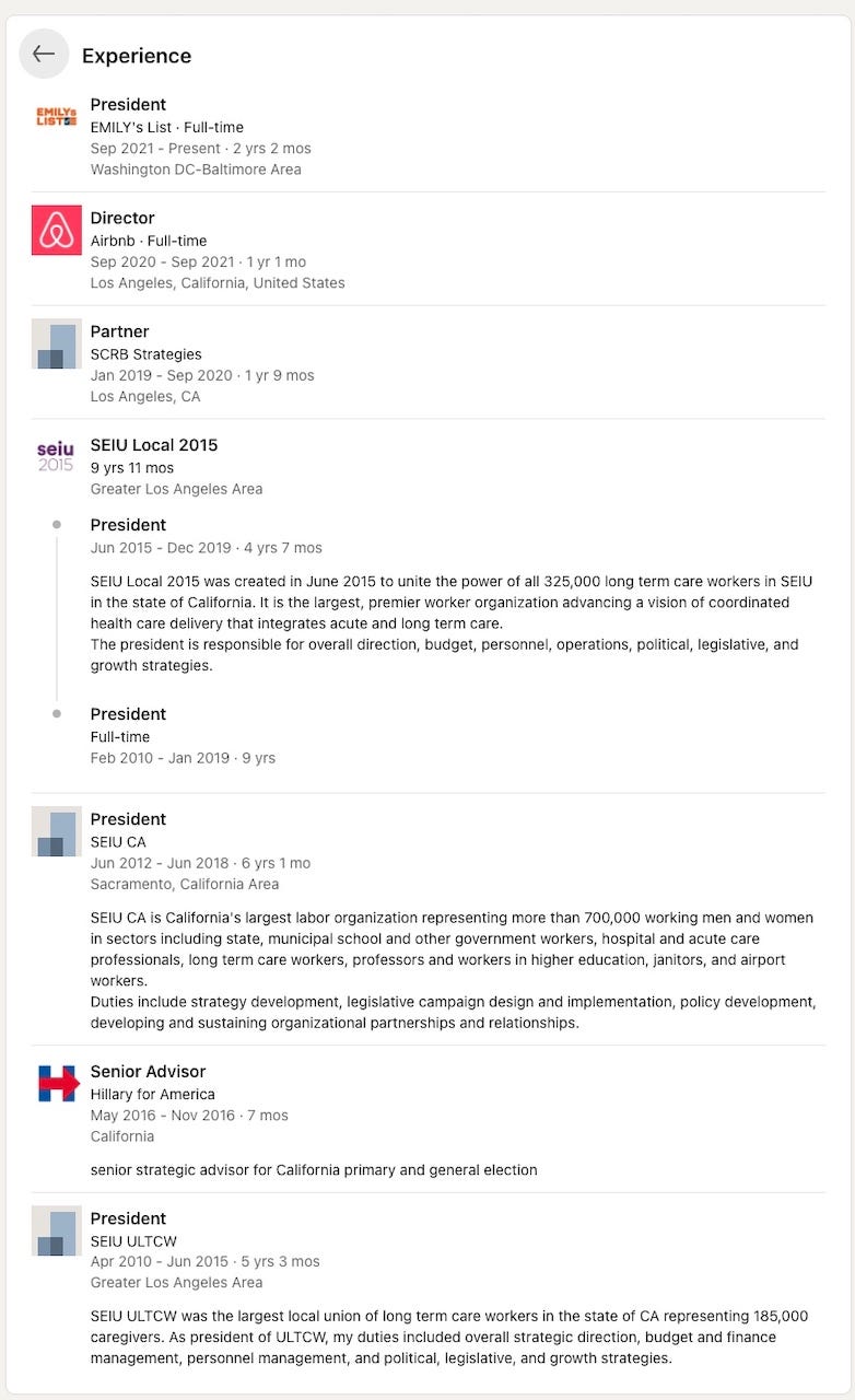 Try this. Pick a politician and look. Let’s do California’s new senator, Laphonza Butler. Here’s her LinkedIn profile: