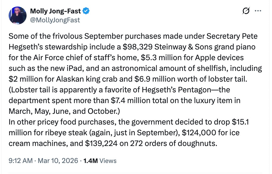 So, “In other pricey food purchases, the government decided to drop $15.1 million on ribeye steak.” Math problem for Molly Jong-Fast: If there are 1.3 million servicemembers on active duty, how much per person is $15.1 million? When you find yourself looking at that number, ask yourself if it counts as pricey.