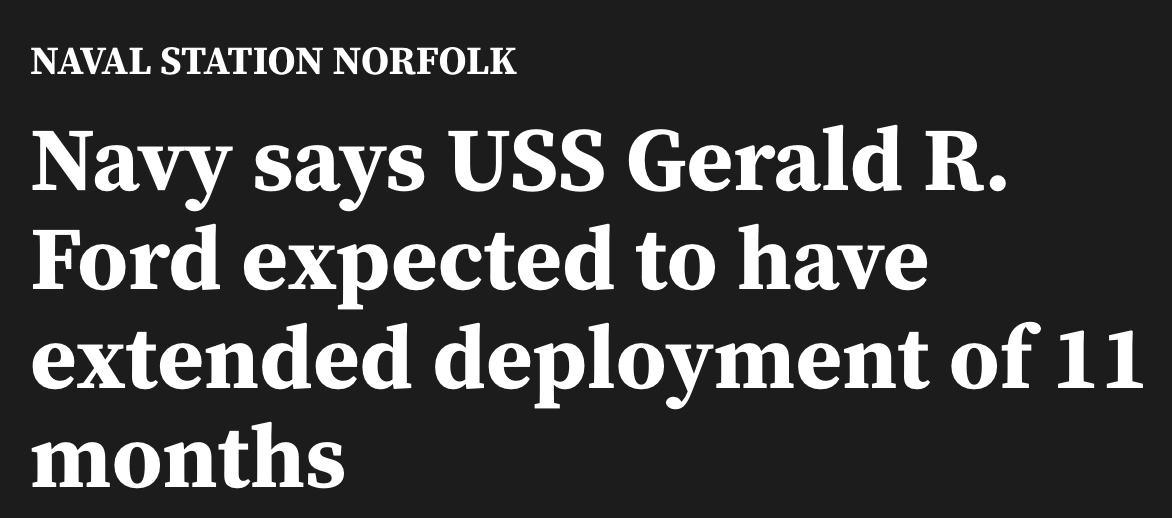 Because we had something close to a 600-ship US Navy in the 1980s, but are now down below 300 ships, a major conflict with Iran has led to the substantial extension of the amount of time sailors are spending at sea, away from their families. The Navy is covering its tactical needs by sending people to sea for a looooong time, extending tours at sea without prior notice. Headline yesterday: