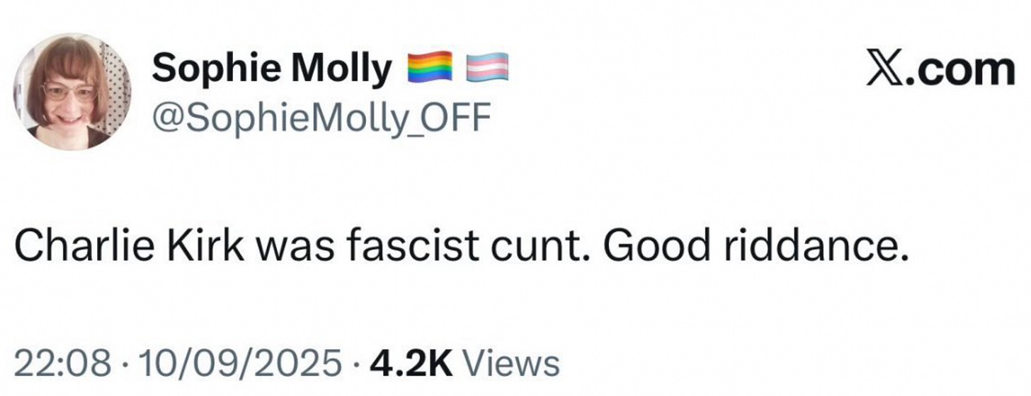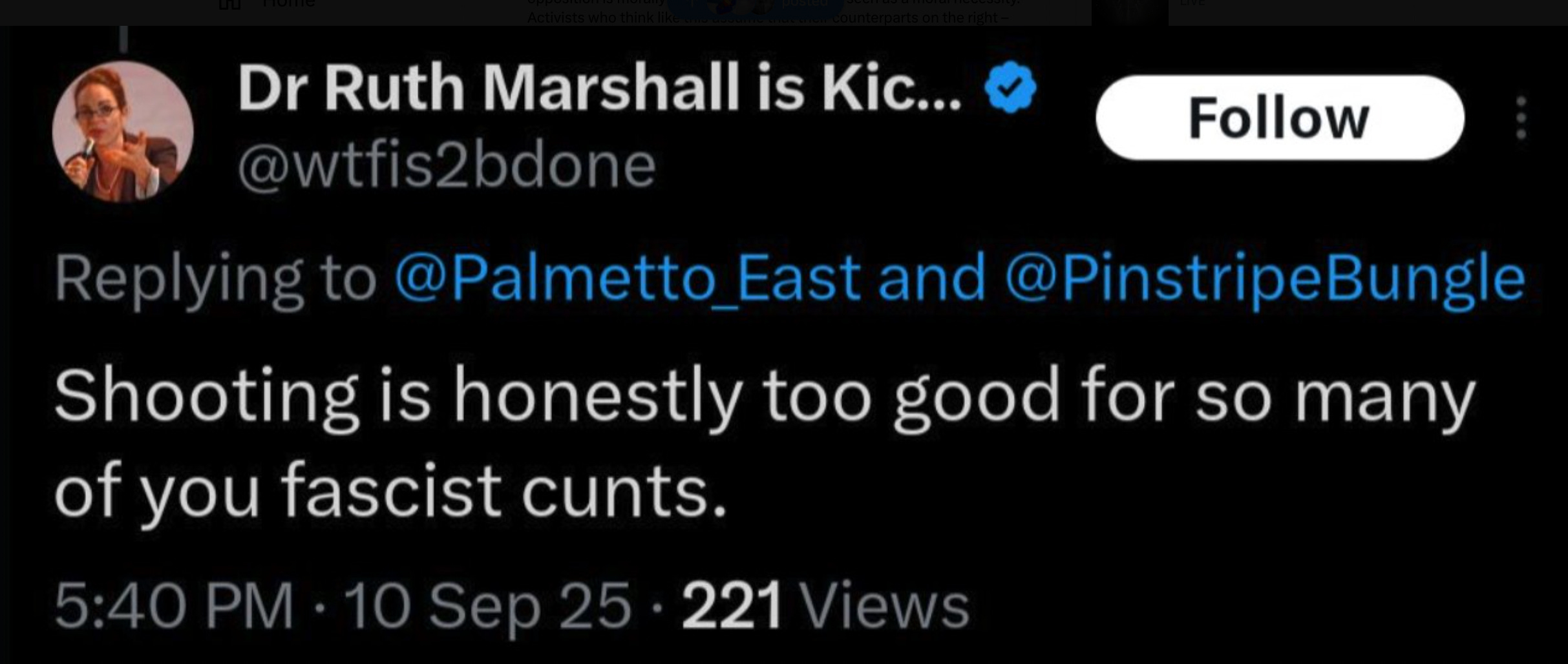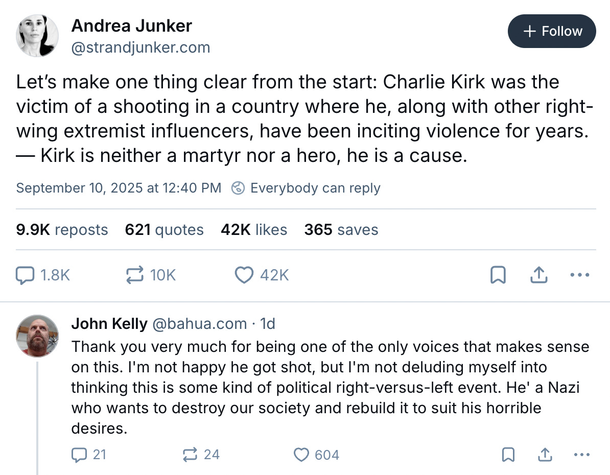 There are liberals, in an older sense, and they’ve been prevalent in the Substack ecosystem: Matt Taibbi, Michael Shellenberger, Bari Weiss, Glenn Greenwald. You should at least notice what Shellenberger just said about the murder of Charlie Kirk. There are people who locate themselves on the political left and who believe in democratic pluralism and freedom of expression. They reject political violence, and they unambiguously defend your right to disagree with them. There are also people on the left who just recognize a descent into political violence as a threat to their own safety, a thing that comes to hurt everyone.