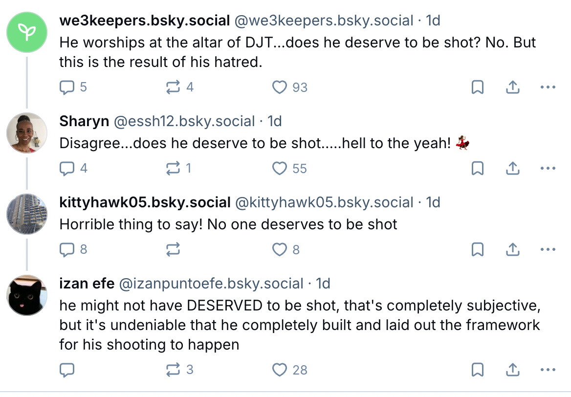 He’s a Nazi, so. “I’m not happy he got shot, but.” Same thread: