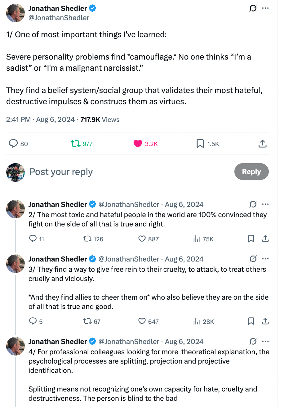 But there’s also a Cluster B left that we all know in our bones, and they find the presence of people who disagree with them at all about anything — that is, of literal Nazis — to validate their sadistic and vicious behavior. Go swim around in Bluesky for a bit, if you doubt it.
