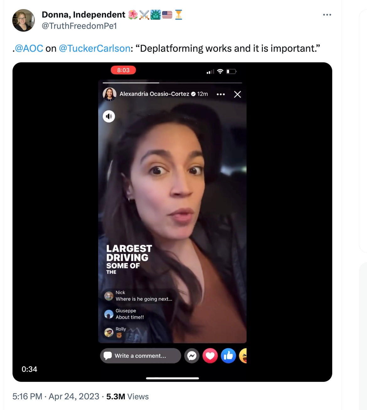 Alexandria Ocasio-Cortez in April, responding to the news that Fox News had fired Tucker Carlson: “Deplatforming works.”