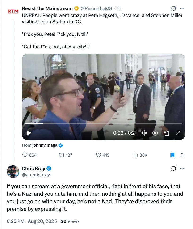 They playact that they live under a fascist regime, but nothing ever happens to them for saying it — because they don’t live under a fascist regime. At all. When you scream FUCK YOU, NAZI at a government official and then walk away and no one cares, you’ve proved that the government official isn’t a Nazi.
