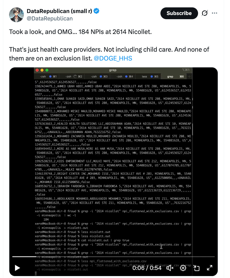 Soofer has due process rights, and he’s entitled to a presumption of innocence until and unless prosecutors prove these charges in court. But note the layering and clustering when fraud allegations start to circulate, as we’re seeing in Minneapolis (screenshot, click the link to play the video):