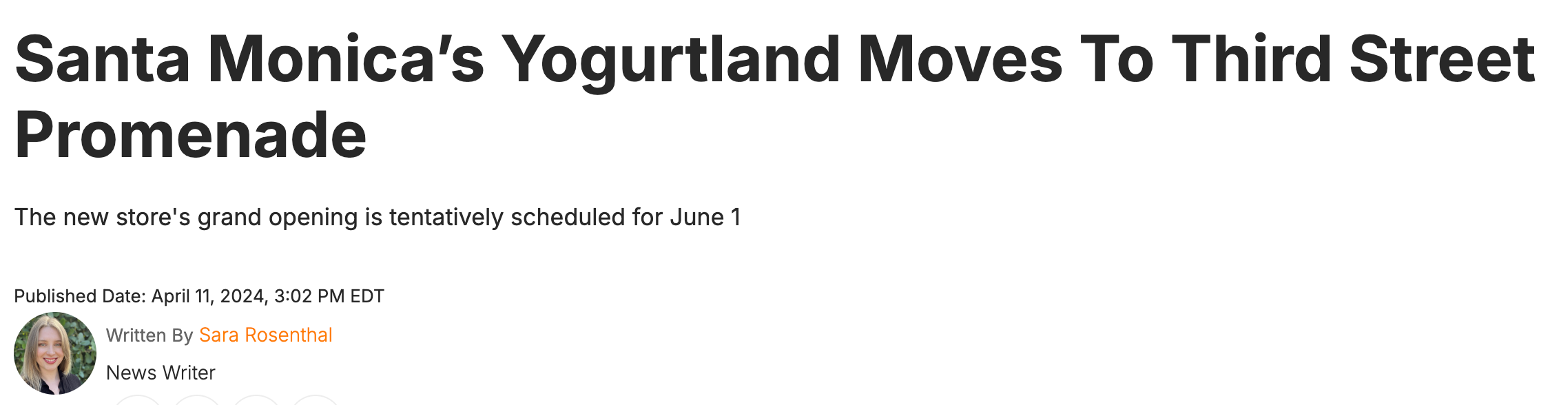 “Yogurtland’s longstanding Santa Monica outpost will be moving to the Third Street Promenade at the start of the summer, according to franchise owner Alex Soofer.”