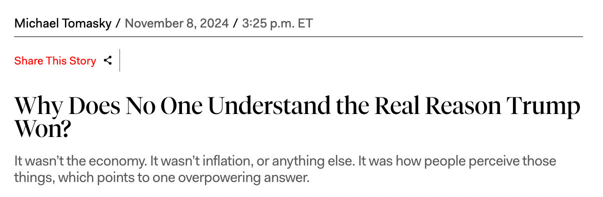 See, the country is working incredibly well, Kamala Harris was brilliant and personable and extremely capable, and Donald Trump literally said he would murder Liz Cheney with a firing squad, but America just didn’t understand all of that. People got brainwashed and magic-card-tricked by the all-powerful right wing media, which made them misperceive reality: