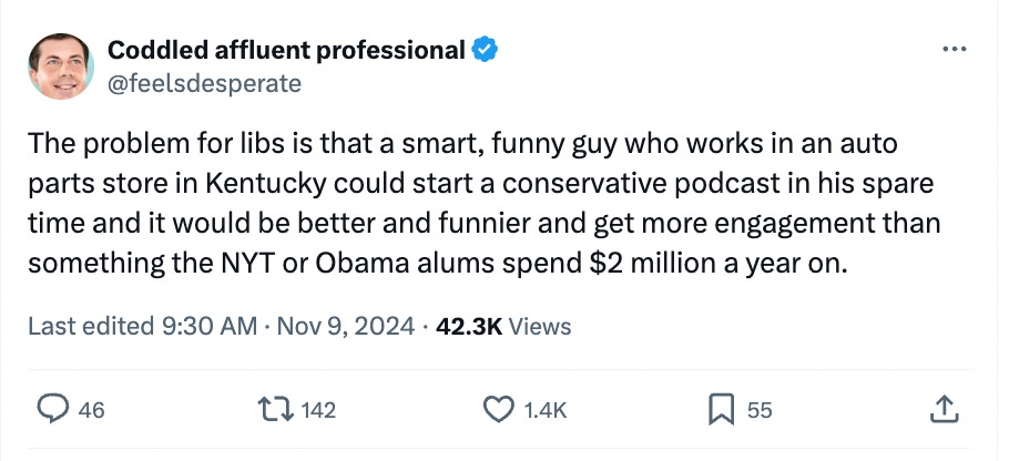 Please tell me you’re laughing out loud as you see what he’s doing. His election postmortem is that he has his hat out on a street corner. A few paragraphs from the top, Tomasky also warns that “billionaires on the right have invested far more heavily in media in the last two decades than their counterparts on the left.” See, you wouldn’t be losing these elections if you’d write me a lot more checks and I had a nicer beach house. After several decades of Beltway journalism, this is how a distinguished old political editor understands the media environment: it’s all a thing that billionaires provide. Trump has a Joe Rogan, so we should get a billionaire of our own to checkbook us one of those. If someone just pays for it, then you immediately have it. Audiences don’t have to be earned; they’re just bought. “Laurene, buy us a Rogan.”