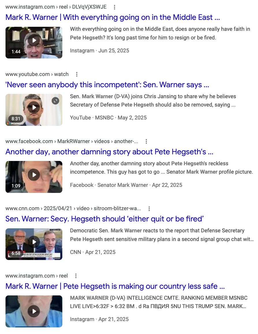 But what’s astonishing to watch is the complete cultural collapse of the political cartels. If you don’t remember it, spend a few minutes searching up the “mainstream” messaging from April about that monster Pete Hegseth. He was done, finished, ruined, out. His departure from government was inevitable and imminent, without the slightest question. Any Democratic Party elected official you can think of, down to the local dogcatcher, posted their “Pete Hegseth must resign” video. Mark Warner posted a bunch of them, frantically.