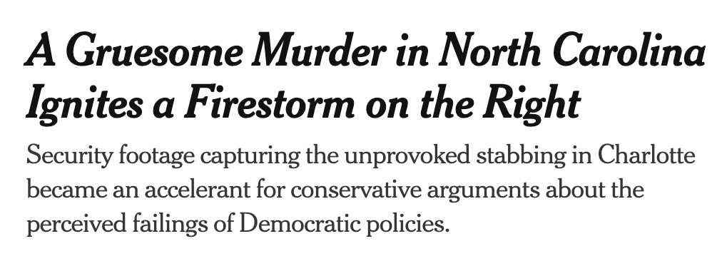 Animals respond to the suffering of other animals. Watch your cat respond to the sound of a cat screaming in pain somewhere out on the other side of the screen door. Any random jackrabbit has more sense than an editor at the New York Times. This topic will not be narrative-enforced into disappearance. And so the narrative enforcement technique of declaring the murder of Iryna Zarutska to be a far-right concern has an enormous accidental effect, especially if you fit it into a long pattern of similarly framed incidents: If this causes you concern and dismay, you are not on the respectable institutional left. If this bothers you, you’re over there with those people! (pause) Wait, where are you going?
