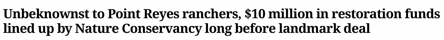 As I noted earlier this month, the Nature Conservancy — which brokered the settlement deal to end the litigation over ranching at Point Reyes — just received a $2.7 million grant from the California Wildlife Conservation Board to manage the post-ranching future of Point Reyes. But that grant is only one piece of their total state government funding for that purpose, and the Press Democrat found the rest. The Nature Conservancy will bring in a lot of money from the State of California to stay on the ground at Point Reyes and manage abandoned ranchland for the federal government.