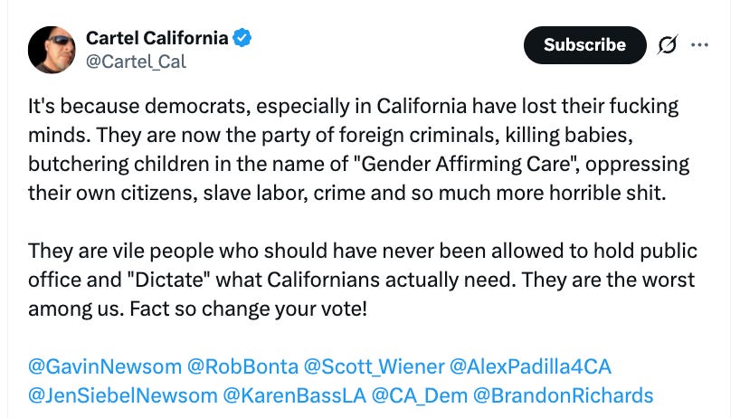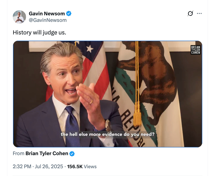 Adding that I think Gavin Newsom has become a genuinely shameful figure, and he has to be treated that way. He is disgraced, and has to be spoken to, and of, as a disgraceful person.