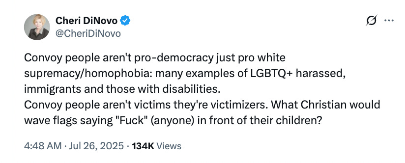 The Fredom Convoy: white supremacist homophobes who harassed and brutalized LGBTQ+ people and immigrants and the disabled, lashing out in a stunning wave of public cruelty. It was like a NUREMBERG RALLY with trucks, obviously. Here, look at some of the monstrous acts of public brutality committed at this mass expression of hate and rage: