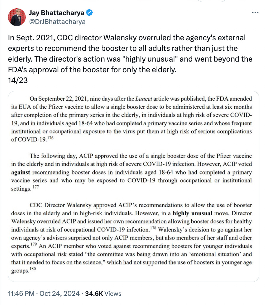 You can also start with Dr. Jay Bhattacharya’s informed and critical summary, in a long thread on I-still-call-it-Twitter here or on Threadreader here. Bottom line up front: “The House report on HHS covid propaganda is devastating. The Biden admin spent almost a billion dollars to push falsehoods about covid vaccines, boosters, and masks on the American people. If a pharma company had run the campaign, it would have been fined out of existence.” Sample observation: