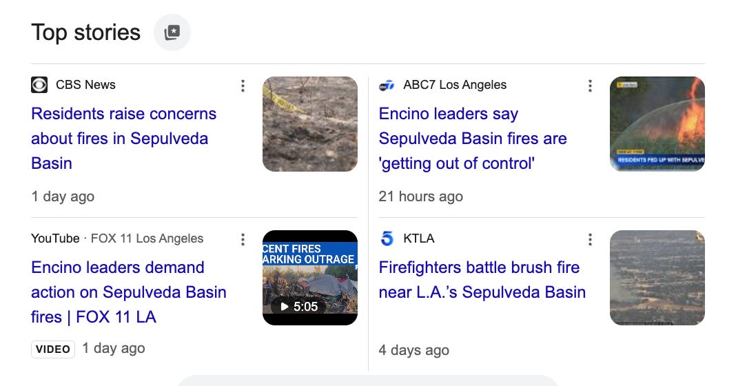 A bunch of news stories in Los Angeles warn this week that there have been 700 fires in the Sepulveda Basin in the last year and a half: