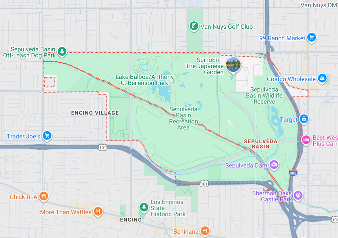 The Sepulveda Basin sits next to the 405 and 101 freeways in the San Fernando Valley, at the intersection of the Los Angeles neighborhoods of Van Nuys, Sherman Oaks, and Encino. It’s a patch of open land in the middle of a bunch of city.