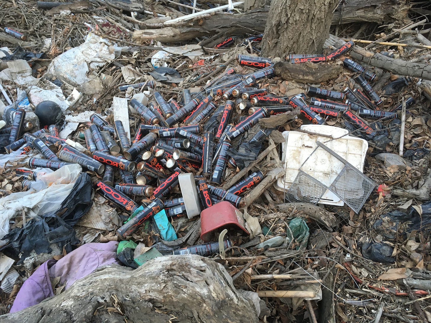 I walked around the Sepulveda Basin in January of 2018, and these are photographs that I took, including one with a big pile of used butane canisters in the middle of all the trash: