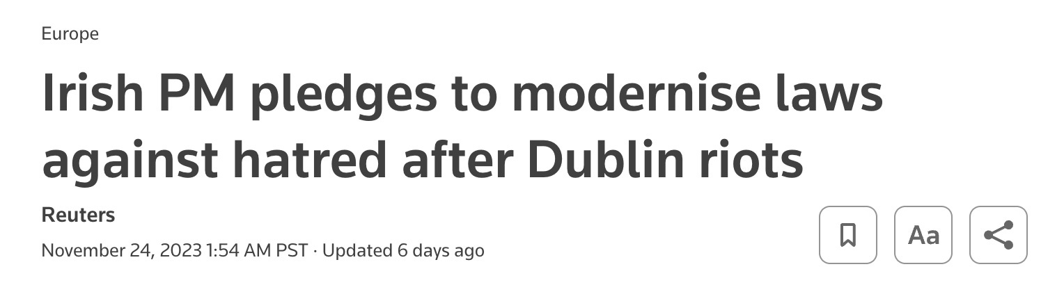 But there it still is, growing in size and power, led by people who are increasingly unguarded about how much they hate the people they govern. The repellent flood of loathing for the “dull, white, pasty” Ireland pouring out of the Irish government, in recent days, is an extraordinary illustration of an ordinary reality. See this: the Irish government hates the Irish. An Algerian immigrant of long residence in Ireland stabbed three Irish children, which angered a bunch of bad, far-right people who lack the sophistication to embrace the stabbing of children, who rioted. Faced with popular anger over a vicious attack on very young children, the Irish government is vowing to crack down on…the people who are angry about the vicious attack on children.