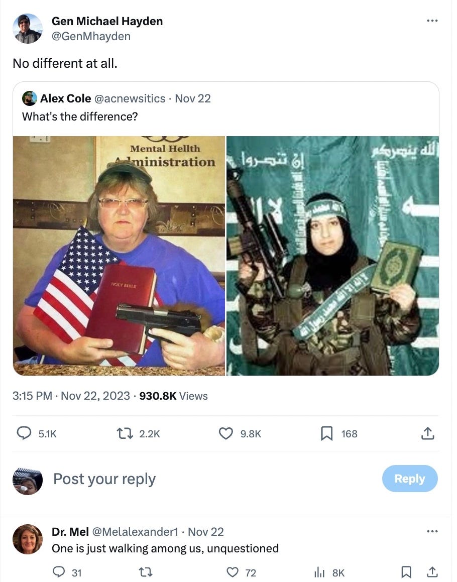 General Michael Hayden is a former director of both the CIA and the NSA, a person who has had considerable power in the the United States. This is what he thinks of Americans who disagree with him about politics and culture: