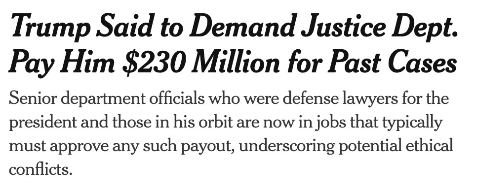 I’ve just filed a FOIA request with the DOJ Civil Division for Trump’s supposed 2023 and 2024 claims, but I don’t expect a quick response. I strongly suspect there’s more to this story than Times is reporting, and don’t miss the fact that the Times makes no reference to the thing I just did: They do not say that they used FOIA to try to obtain Trump’s supposed claims. Why on earth would a newspaper claim that the President of the United States is trying to shake down the federal government for $230 million without assembling the paper trail?