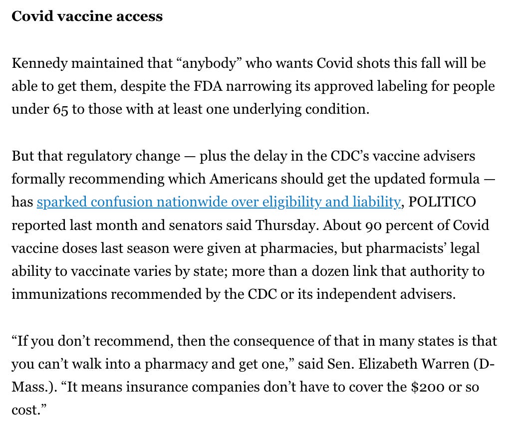 Warren’s angry theme was that Americans are desperate to get more of these wonderful, lifesaving Covid-19 vaccines, but mean RFK Jr. won’t let them. We’ve all become Medical Oliver Twist.