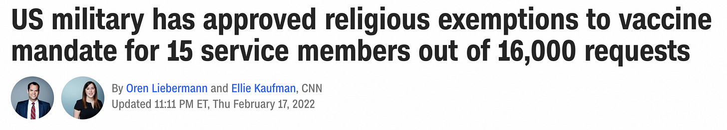 So forced injections of questionable safety and value plus a promise of more political surveillance plus a war fought for twenty years without a plan isn’t leading to strong retention and recruiting. Didn’t see that coming, did you?