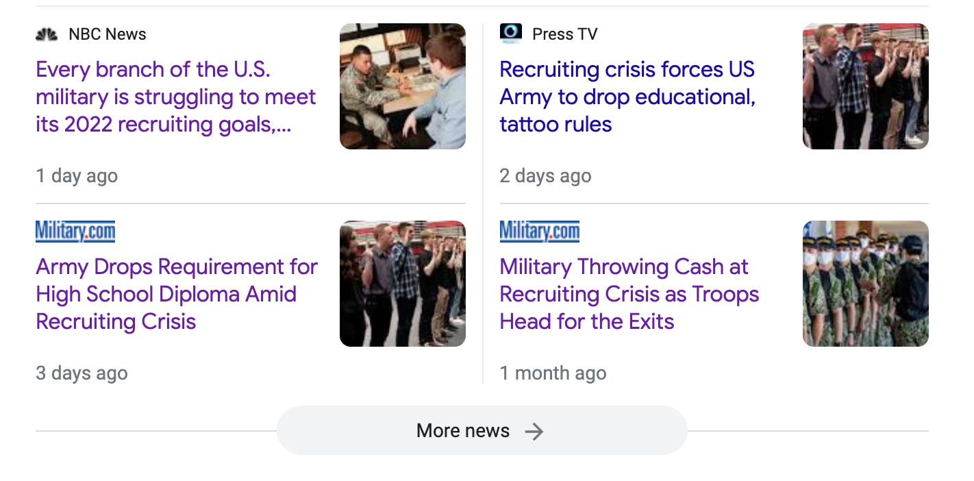 Well, the incredibly painful woke recruiting advertising is not helping, either. I saw an ad that felt more like a teen vogue invitation to join a non-binary college organization (was gonna say sorority, but goodness, what a gendered word and organization!) that sometimes traveled the world. Had to watch it a few times to convince my brain it really was an army recruitment ad.