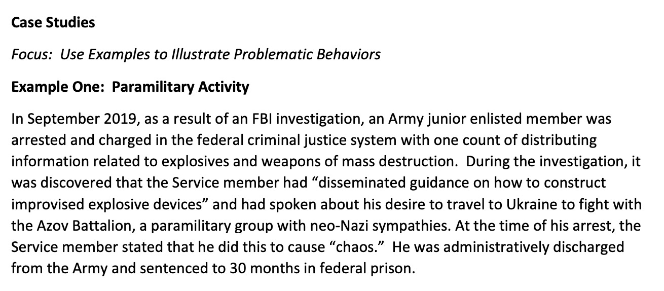 Indoctrination sessions focused on the duty to report “extremist” thought; in a personal favorite of the form, an army training document warned, in February of 2021, that some servicemembers were such dangerous extremists that they supported Ukrainian paramilitary groups: